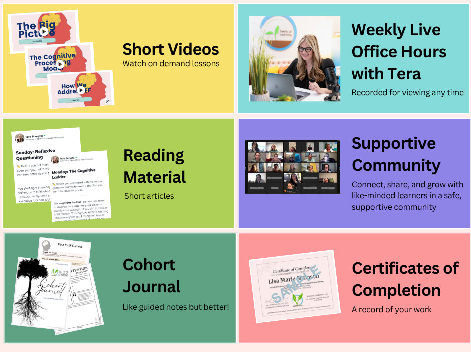 The Seeds of Learning® Online Cohort Community (the Community) is a global education and support network for parents and professionals who are passionate about childhood executive function (EF) and learning. It is designed to help you understand and support the root causes of learning challenges through the Sumpter Executive Function Framework (SEFF)—a groundbreaking and holistic approach to the assessment and treatment of childhood learning needs, created by Seeds of Learning® founder Tera Sumpter.